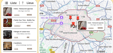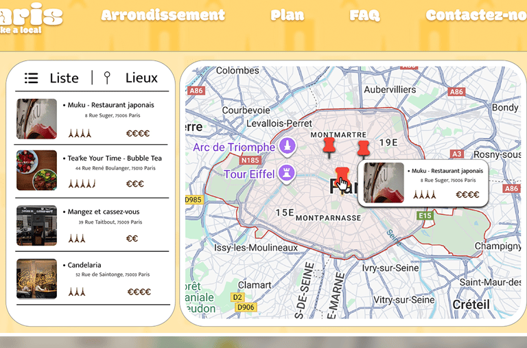 Pour la maquette web de « Paris Like a Local », j’ai conçu une interface centrée sur la navigation par arrondissement. Mon travail s’est porté sur l’organisation des informations, la lisibilité des listes de lieux et l’intégration d’une carte interactive permettant une exploration intuitive de la ville. L’objectif était de traduire visuellement l’idée d’un guide local, accessible et pratique, tout en assurant une cohérence générale avec l’identité graphique du projet.